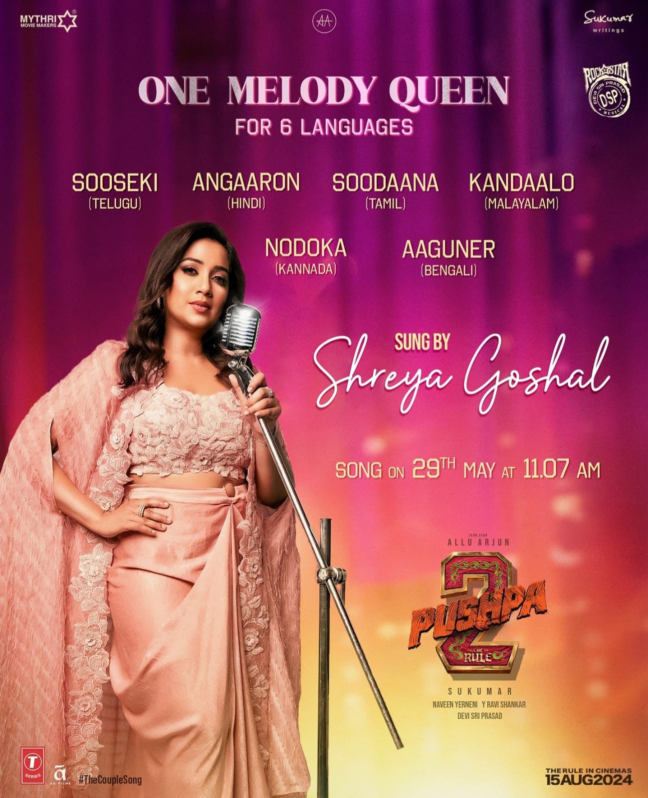 पुष्पा 2: द रूल में पुष्पराज के आने को लेकर एक्साइटमेंट, फिल्म की घोषणा के समय से ही बना हुआ है और वह हर बीततेदिन के साथ बढ़ता जा रहा है। फिल्म के जबरदस्त टीजर के बाद रिलीज हुए फिल्म के पहले गाने "पुष्पा पुष्पा" की रिलीज केसाथ यह नए स्तर और भी ऊपर पहुंच गया है। एक्साइटमेंट को और ज्यादा बढ़ाने के लिए, मेकर्स फिल्म से दूसरा सिंगल, "दकपल सॉन्ग" रिलीज करने के लिए तैयार हो रहे हैं, जिसे सुरीली आवाज की मलिका श्रेया घोषाल ने छह अलग-अलग भाषाओंमें गाया है।