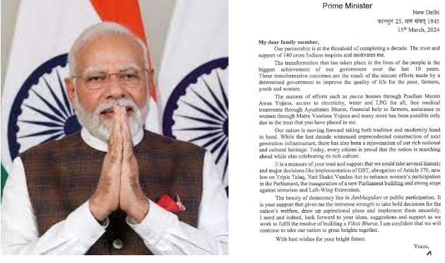 अपने पत्र में, प्रधान मंत्री मोदी ने नागरिकों को "परिवार के सदस्य" के रूप में संदर्भित किया और उन नीतियों और कार्यक्रमों को रेखांकित किया जिन्हें उनके प्रशासन ने पिछले दो कार्यकालों के दौरान लागू किया था। उन्होंने जनता से सिफारिशें भी मांगीं।अपने पत्र में, प्रधान मंत्री ने कहा, "पिछले दशक में हमारी सरकार की सबसे बड़ी उपलब्धि लोगों के जीवन में परिवर्तन रही है। ये परिवर्तनकारी प्रभाव गरीबों, किसानों, युवाओं और महिलाओं के जीवन की गुणवत्ता में सुधार के लिए प्रतिबद्ध सरकार के ईमानदार प्रयासों का परिणाम हैं।