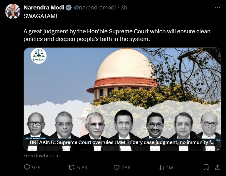 सुप्रीम कोर्ट ने पलटा 25 साल पुराना फैसला, नोट लेकर सदन में वोट द...