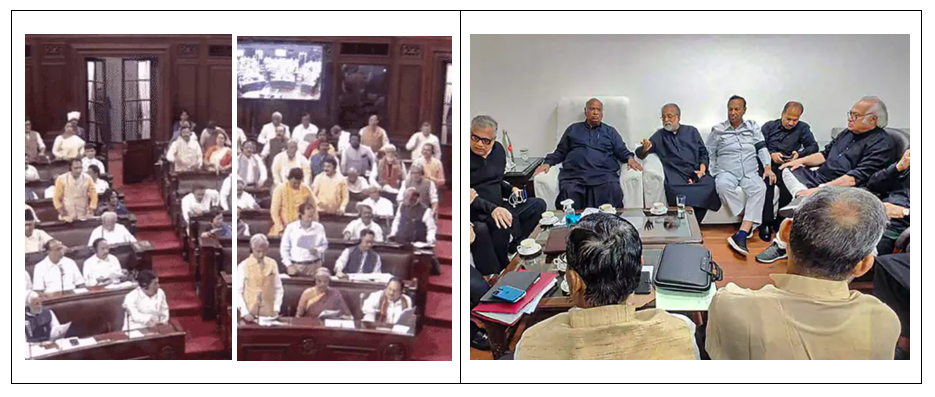 लोकसभा में हंगामा कर रहे विपक्ष को स्पीकर ओम बिड़ला ने फटकार लगाई। उन्होंने कहा, पूरा देश देख रहा है, आप कैसा उदाहरण पेश करना चाहते हैं। हंगामा नहीं रुका तो सदन दोपहर 2 बजे तक स्थगित कर दिया। जिसके बाद फिर सदन बैठा, लेकिन नारेबाजी लगातार जारी रही। एस जयशंकर और अधीर रंजन चौधरी के स्टेटमेंट के दौरान जमकर हंगामा हुआ, सदन 3 बजे तक स्थगित किया गया। फिर 2 बिल पास हुए और कार्यवाही शुक्रवार तक के लिए स्थगित कर दी गई। वहीं, राज्यसभा में शुरुआत में करीब एक घंटे कार्यवाही चली। विदेश मंत्री एस जयशंकर जब बोल रहे थे तब विपक्ष नारेबाजी करता रहा। जवाब में BJP सांसदों ने मोदी-मोदी के नारे लगाए। जवाबी नारेबाजी में विपक्ष I.N.D.I.A-I.N.D.I.A के नारे लगाने लगा। शोर न रुकता देख सभापति जगदीप धनखड़ ने सदन को पहले 12 बजे तक, फिर 2 बजे तक स्थगित किया। उसके बाद जब कार्यवाही शुरू हुई तो विपक्ष सदन से वॉकआउट कर गया। इसके बाद सिनेमैटोग्राफ अधिनियम 1952 में संशोधन करने वाला बिल ध्वनि मत से पारित हो गया।