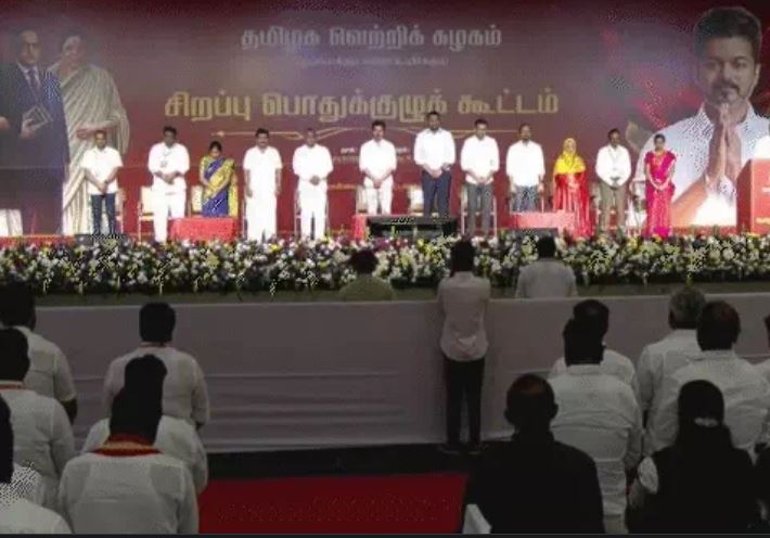 करूर भगदड़ के बाद यह पहली बार था जब विजय ने पार्टी की स्पेशल जनरल काउंसिल की बैठक में कार्यकर्ताओं को संबोधित किया। उन्होंने कहा कि आगामी विधानसभा चुनाव में मुकाबला सिर्फ दो पार्टियों के बीच होगा — TVK और सत्तारूढ़ DMK। विजय ने दावा किया कि उनकी पार्टी 2026 के चुनाव में मजबूती से उतरेगी और 100% जीत हासिल करेगी।