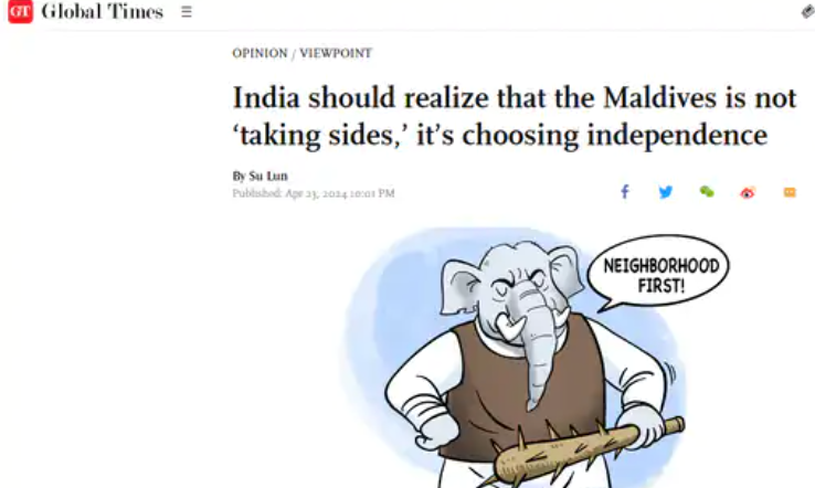 तो वहीं, ग्लोबल टाइम्स ने अपने आर्टिकल में आगे लिखा, भारत के आक्रामक रवैये के कारण पड़ोसी देशों में भारत विरोधी भावनाएं पैदा हो रही हैं। भारत- चीन दुश्मन नहीं बल्कि पार्टनर हैं। मालदीव के लोगों ने भी मुइज्जू को इसलिए चुना है क्योंकि उन्हें लगता है कि भारत मालदीव के आंतरिक मामलों में दखल दे रहा है, जिससे उसकी स्वतंत्रता को खतरा है। मालदीव भारत और चीन दोनों से अच्छे रिश्ते रखना चाहता है। मालदीव के चुनाव उनका आंतरिक मसला है और चीन इस बात का सम्मान करता है। लेकिन कुछ पश्चिमी मीडिया ने इन चुनावों को सुर्खियों में लाने का काम किया। उन्होंने कहा कि यह चुनाव असल में भारत और चीन के बीच मुकाबला है। इसके अलावा भारत में भी कुछ मीडिया आउटलेट ने अपनी रिपोर्ट्स में कहा कि मालदीव का झुकाव चीन की तरफ बढ़ रहा है।