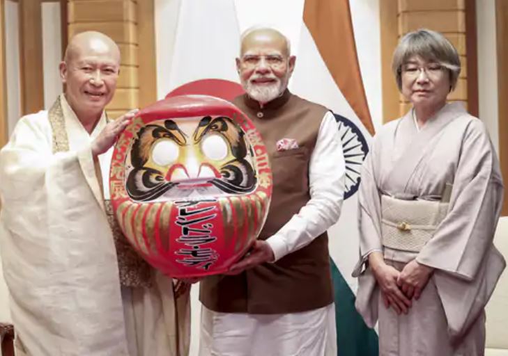जापानी कलाकारों द्वारा प्रस्तुत पारंपरिक कार्यक्रम में मोदी ने विशेष रुचि दिखाई। उन्होंने कलाकारों से हिंदी भजन सीखने के अनुभवों के बारे में भी पूछा। जापानी महिलाओं ने बताया कि वे कई सालों तक गुजरात और राजस्थान में रहकर भारतीय भाषा और भजनों की शिक्षा ले चुकी हैं। इस बीच, टोक्यो स्थित प्रसिद्ध शोरिनजन दारुमा जी मंदिर में प्रधानमंत्री मोदी विशेष रूप से पहुंचे। मंदिर के मुख्य पुजारी ने उन्हें दारुमा गुड़िया भेंट की, जिसे जापान में सौभाग्य और सफलता का प्रतीक माना जाता है। कागज से बनी यह लाल रंग की गुड़िया बुरी आत्माओं को दूर रखने का प्रतीक भी मानी जाती है। मान्यता है कि दारुमा ने लगातार नौ साल ध्यान लगाया था और इसी कारण इस गुड़िया का गोल आकार उनके मुड़े हुए हाथ-पैर का प्रतीक है। ताकासाकी शहर, जहां यह मंदिर स्थित है, दारुमा गुड़ियों का जन्मस्थान माना जाता है। यह खिलौना इस तरह डिजाइन किया गया है कि गिरने पर भी खुद सीधा खड़ा हो जाता है, जिसे जीवन में धैर्य और स्थिरता का प्रतीक माना जाता है।
