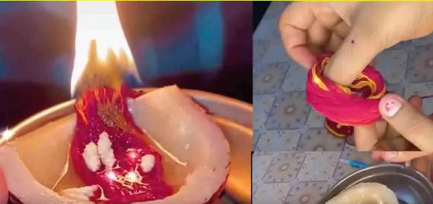 सबसे पहले एक कलावा लें. वही कलावा लें, जिसमें 5 धागे हों। कलावे को अपने हाथ पर 73 बार लपेटें और बचे हुए धागे को काट लें। लपेटे हुए कलावे को बीच से काट लें और धागे को बत्ती की तरह सीधा कर लें। -बत्ती बनाने के बाद एक कटा हुआ नारियल लें. नारियल में देशी घी और 3 से 5 दाने खीर के डाल दीजिये. नारियल में कलावे का दीपक रखें और फिर उसे जला दें। इस दीपक को घर के मंदिर में रखें।