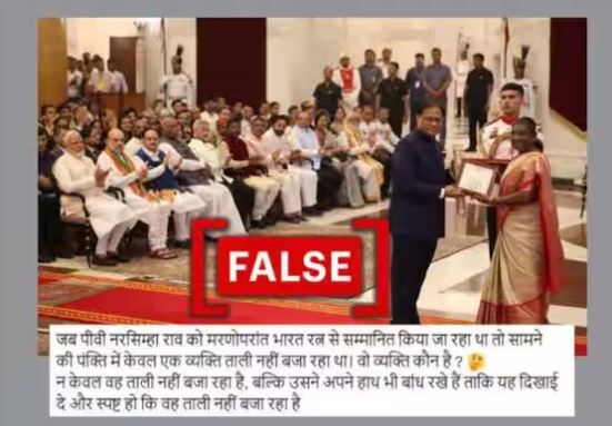 कई यूजर्स ने इस दावे के साथ तस्वीर को एक्स (पूर्व में ट्विटर) पर शेयर किया। एक यूजर ने लिखा, "जब पीवी नरसिम्हा राव को मरणोपरांत भारत रत्न से सम्मानित किया जा रहा था, तो सामने की पंक्ति में केवल एक व्यक्ति ताली नहीं बजा रहा था। न केवल वह ताली नहीं बजा रहा था, बल्कि उसने अपने हाथ भी ऐसे ही पकड़ रखे थे। वह इसे दृश्यमान और स्पष्ट रख रहा है।" कि वह ताली नहीं बजा रहा है।" इस पोस्ट को अब तक 89,000 से ज्यादा बार देखा जा चुका है. समान दावों के साथ साझा किए गए पोस्ट के संग्रहीत संस्करण यहां, यहां और यहां पाए जा सकते हैं।