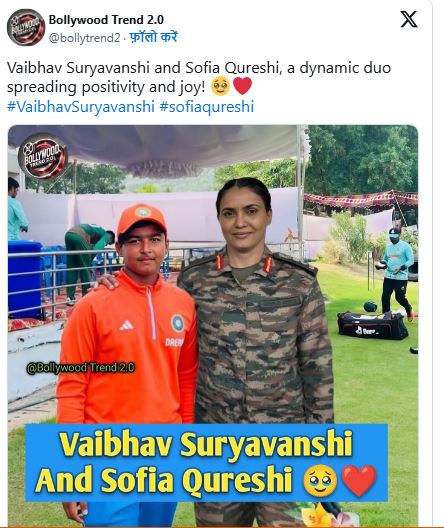 एक सोशल मीडिया यूजर bollytrend2 ने एक फोटो शेयर की जिसमें कर्नल सोफिया और वैभव सूर्यवंशी को एक साथ दिखाया गया है। इस फोटो के साथ कैप्शन था –