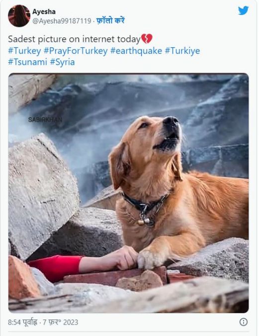 इस बीच सोशल मीडिया पर एक कुत्ते की सबसे मार्मिक तस्वीर तेजी से वायरल हो रही है, जिसमें एक कुत्ता भूकंप के बाद अपने मालिक को मलबे से बचाने की कोशिश करता नजर आ रहा है. इस तस्वीर को फेसबुक, ट्विटर और इंस्टाग्राम पर सैकड़ों लोगों ने शेयर किया है। वायरल तस्वीर में एक कुत्ते को काला कॉलर पहने हुए भी देखा जा सकता है। इसके साथ ही मलबे से एक हाथ निकलता दिख रहा है। सोशल मीडिया पर कई लोगों ने इसे इंटरनेट पर "सबसे दुखद तस्वीर" कहा और दावा किया कि यह तस्वीर भूकंप के बाद तुर्की के इज़मिर की है।