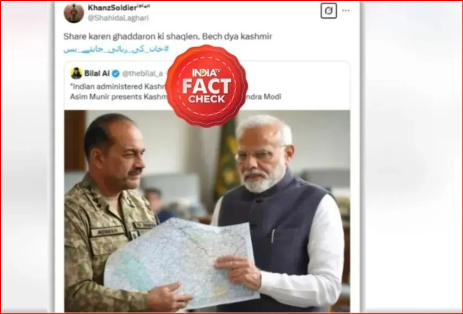 सोशल मीडिया पर एक तस्वीर तेजी से वायरल हो रही है, जिसमें दावा किया जा रहा है कि पाकिस्तान के सेना प्रमुख जनरल सैयद असीम मुनीर अहमद शाह ने भारतीय प्रधानमंत्री नरेंद्र मोदी को कश्मीर का नक्शा भेंट किया है। हालाँकि, इंडिया टीवी द्वारा की गई तथ्य-जांच से पुष्टि हुई है कि यह दावा पूरी तरह से फर्जी है और इसे डिजिटल रूप से हेरफेर करके बनाया गया है।