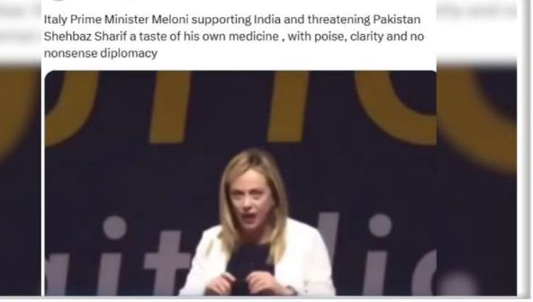 सोशल मीडिया पर यह वीडियो वायरल हो रहा है, जिसमें इटली की प्रधानमंत्री Giorgia Meloni को भाषण देते हुए देखा जा सकता है। यूजर्स ने इस वीडियो के साथ कई भ्रामक दावे किए हैं। कुछ यूजर्स ने पोस्ट में लिखा कि "इटली की प्रधानमंत्री जॉर्जिया मेलोनी ने पाकिस्तान को कड़ी चेतावनी दी है और दावा किया है कि कल तक पाकिस्तान नक्शे से मिट जाएगा।" एक और यूजर ने लिखा, "मेलोनी ने भारत का समर्थन किया और पाकिस्तान को धमकाया, शहबाज शरीफ को उनकी ही दवा का स्वाद चखाया।" इन दावों के साथ इस वीडियो को सोशल मीडिया पर भारी संख्या में शेयर किया गया।
