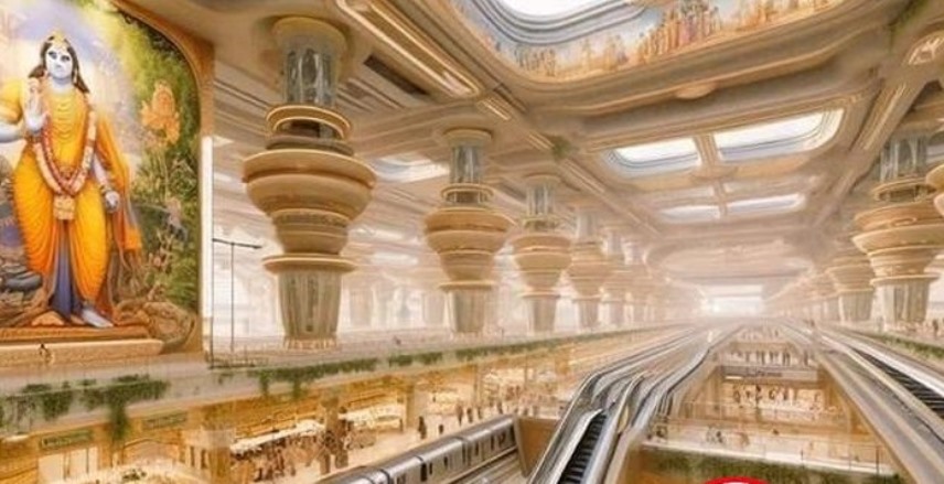 वायरल तस्वीर में भव्य मेट्रो स्टेशन दिखाया गया है, जो किसी धार्मिक स्थल और महल के खंडहरों पर बना हुआ प्रतीत होता है। मेट्रो स्टेशन पर दीवार पर भगवान राम की एक बड़ी तस्वीर टंगी नजर आ रही है. स्टेशन का दांता किसी मंदिर या महल जैसा दिखता है।