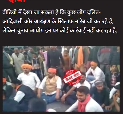 वीडियो में देखा जा सकता है कि कुछ लोग दलित-आदिवासी और आरक्षण के खिलाफ नारे लगा रहे हैं, लेकिन चुनाव आयोग उन पर कोई कार्रवाई नहीं कर रहा है.