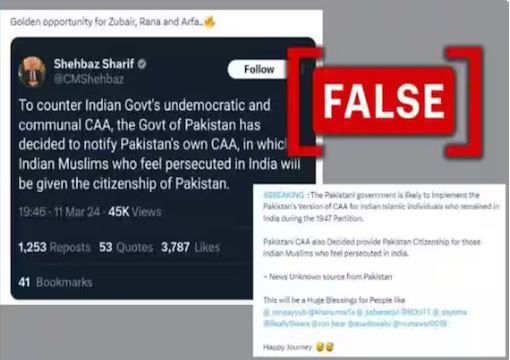 इस बीच पाकिस्तान के प्रधानमंत्री शहबाज शरीफ की एक कथित एक्स (पूर्व में ट्विटर) पोस्ट का स्क्रीनशॉट सोशल मीडिया पर वायरल हो रहा है। इसमें लिखा है: "भारत सरकार के अलोकतांत्रिक और सांप्रदायिक सीएए का मुकाबला करने के लिए, पाकिस्तान सरकार ने पाकिस्तान को अपने स्वयं के सीएए को अधिसूचित करने का निर्णय लिया है, जो भारत में उत्पीड़ित भारतीय मुसलमानों को पाकिस्तानी नागरिकता प्रदान करेगा।" इस स्क्रीनशॉट को शेयर करने वाले पोस्ट को अब तक 3,60,000 से ज्यादा बार देखा जा चुका है और 4,000 बार रीपोस्ट किया गया है। ऐसी पोस्टों के संग्रहीत संस्करण यहां, यहां और यहां पाए जा सकते हैं।
