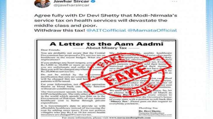 सोशल मीडिया पर आए दिन फेक न्यूज की बाढ़ सी आ जाती है। इन खबरों के जरिए जनता में सनसनी फैलाने की कोशिश की जाती है । इसी बीच एक खबर सामने आ रही हैं जिसमें कहा जा रहा है कि, केंद्र सरकार ने हाल के बजट में स्वास्थ्य सेवा पर पांच फीसदी टैक्स लगाने का प्रस्ताव किया है । मगर जब इस वायरल मैसेज की सच्चाई का पता पीआईबी ने किया तो, उन्होंने इस खबर को फर्जी घोषित किया । उन्होंने इस पत्र को ट्वीट के साथ भी अटैच किया है और कहा है कि, यह पत्र वर्ष 2011 का है । इसके आगे पीआईबी ने कहा हैं कि, इसे गलत तरीके से शेयर किया गया है । पीआईबी के दावे को गलत तरीके से पेश किया गया है और इसके आगे पीआईबी ने कहा है कि, केंद्र सरकार ने ऐसी कोई घोषणा नहीं की है।