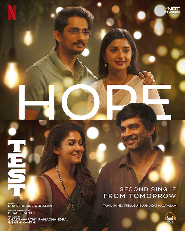 Y Not Studios ने अपने आगामी स्पोर्ट्स ड्रामा टेस्ट के दूसरे गाने 'होप' का फर्स्ट लुक पोस्टर जारी किया है। यह गाना, जिसे शक्षित्री गोपालन नेसंगीतबद्ध किया है, तमिल, तेलुगु, हिंदी, मलयालम और कन्नड़ भाषाओं में उपलब्ध होगा। यह सांग कल रिलीज़ होगा, और यह फिल्म 4 अप्रैल2025 को नेटफ्लिक्स पर रिलीज़ होने के लिए तैयार है। पोस्टर से यह संकेत मिलता है कि यह गाना फिल्म की भावनात्मक और प्रेरणादायक कथा केसाथ पूरी तरह से मेल खाता है।