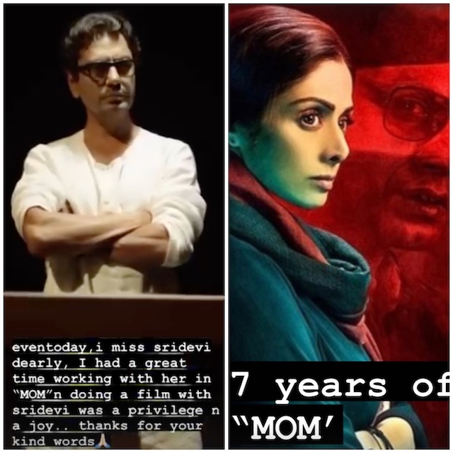 नवाज़ुद्दीन ने अपने सोशल मीडिया पर एक क्लिप शेयर की जिसमे श्रीदेवी बता रही है की उनके साथ काम करके उन्हें कितनाअच्छा लगा।उनके काम को वह कितना पसंद करती थी। इसके बाद नवाज़ ने भी लिखा, "आज भी मैं श्रीदेवी जो को याद करताहूँ। उनके साथ फिल्म 'मॉम' में काम करके मुझे बहुत अच्छा लगा था। उनके साथ काम करना मेरे लिए बहुत बड़ी सौभाग्य कीबात थी। आपके शब्दों के लिए बहुत धन्यवाद्। "