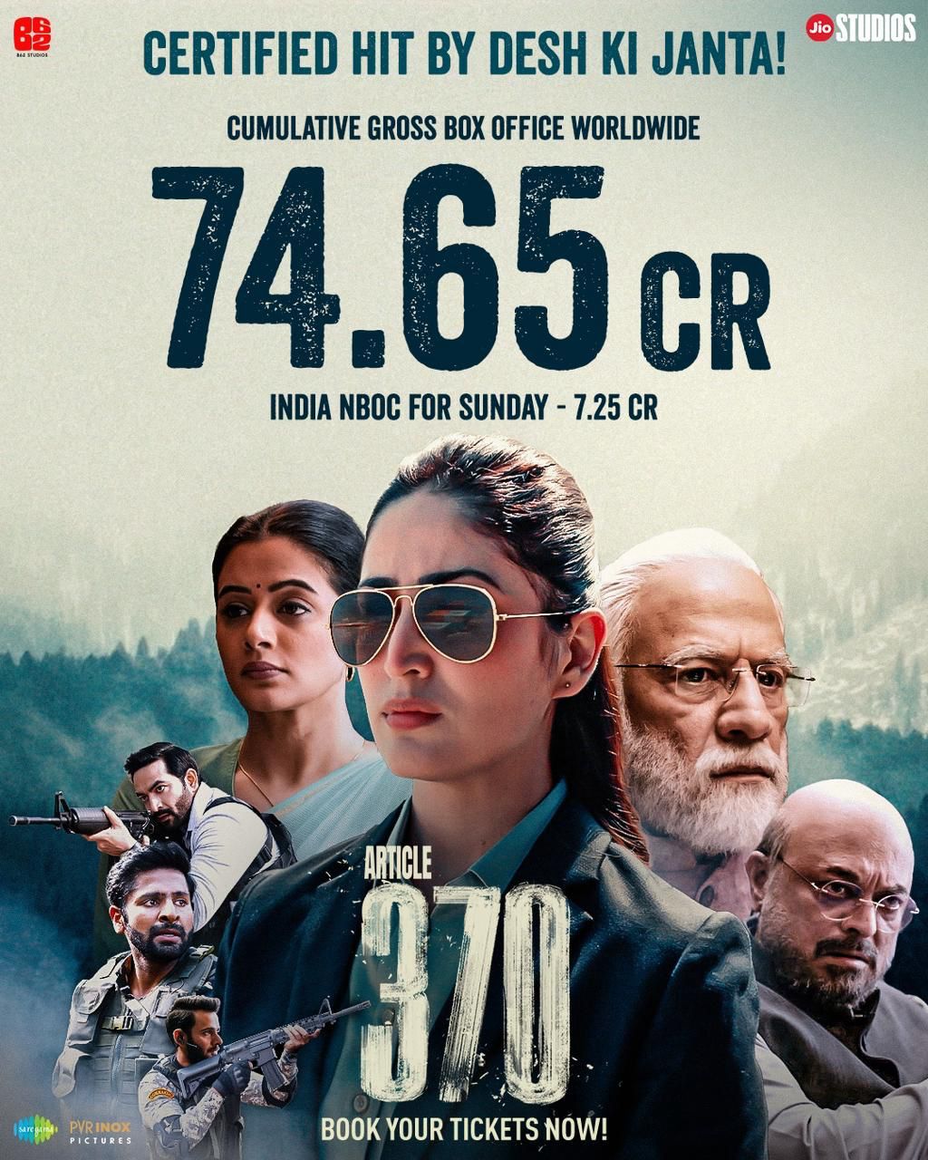 आर्टिकल 370 को जो चीज़ अलग करती है, वह है इसकी दमदार कहानी। जिसकी वजह से फिल्म को दर्शकों का ढेर साराप्यार मिल रहा है और इस बात को सभी तक पहुंचा रहे हैं । इस आर्गेनिक बज ने फिल्म को अभूतपूर्व सफलता दिलाई है, जोशुक्रवार को 3.12 करोड़, शनिवार को 5.25 करोड़ और रविवार को 7.25 करोड़ की सप्ताहांत कमाई में परिलक्षित होती है, जोकुल मिलाकर ₹ 54.44 करोड़ तक पहुंच गई है। सप्ताहांत के कारोबार में उछाल फिल्म की व्यापक स्वीकृति और स्थायीअपील के शानदार समर्थन के रूप में कार्य करता है।