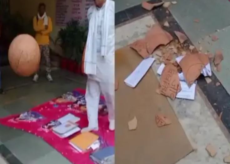 ग्वालियर में पूर्व मानसेवी शिक्षक दंडवत करते हुए जीवाजी यूनिवर्सि...
