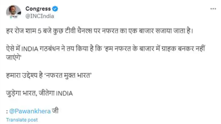 कांग्रेस ने सोशल मीडिया पर स्टेटमेंट जारी करते हुए कहा, हर रोज शाम 5 बजे कुछ टीवी चैनल्स पर नफरत का एक बाजार सजाया जाता है। ऐसे में INDIA गठबंधन ने तय किया है कि 'हम नफरत के बाजार में ग्राहक बनकर नहीं जाएंगे' हमारा उद्देश्य है ‘नफरत मुक्त भारत’ जुड़ेगा भारत, जीतेगा INDIA. आपको बता दे दें, इंडियन नेशनल डेवलपमेंटल इन्क्लूसिव अलायंस' (I.N.D.I.A) नामक विपक्षी गठबंधन की अब तक तीन बैठक हो चुकी है। इसमें कांग्रेस अध्यक्ष मल्लिकार्जुन खड़गे और बिहार के CM नीतीश कुमार समेत 28 विपक्षी दलों के नेता शामिल हुए। बैठक में कोऑर्डिनेशन और कैंपेन समेत 5 कमेटियां बनाई गईं। साथ ही अगली यानि चौथी बैठक दिल्ली में हो सकती है, ऐसी भी चर्चा है की चौथी बैठक भोपाल में भी हो सकती है।