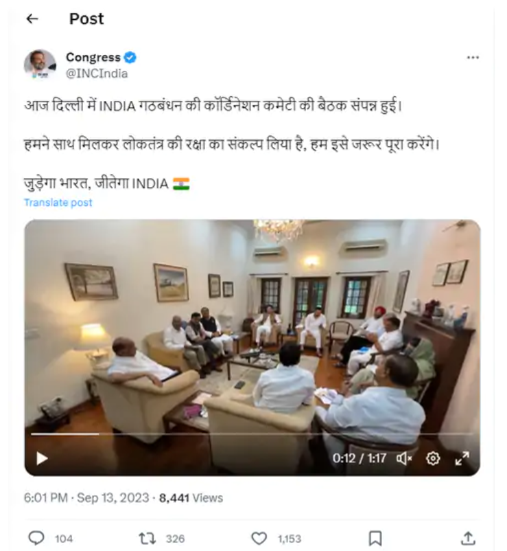 तो वहीं, I.N.D.I.A की कोऑर्डिनेशन कमेटी की बैठक को बीजेपी नेता संबित पात्रा ने हिंदू विरोधी बता दिया। उन्होंने कहा कि यह सीट शेयरिंग की बैठक नहीं है। इसका उद्देश्य हिंदू धर्म को खत्म करना है। उन्होंने हिंदू धर्म को डेंगू और मलेरिया, कोरोना और एड्स कहा था। वे हिंदू धर्म की तुलना ऐसी बीमारियों से करते हैं। यह हमारे समाज के लिए खतरा है। जवाब में संजय राउत ने कहा कि इस देश में कोई भी हिंदू विरोधी नहीं है। इस देश में हर धर्म का सम्मान किया जाता है। उधर, मीटिंग से पहले DMK सांसद टीआर बालू ने कहा कि आज बैठक में हम सीट बंटवारे पर भी चर्चा करेंगे। साथ ही संसद के स्पेशल सेशन के लिए रणनीति भी बनाई जाएगी। नेशनल कॉन्फ्रेंस के नेता उमर अब्दुल्ला ने कहा कि बैठक का एजेंडा क्या है, यह बाद में पता चलेगा। सीट बंटवारे में किस फॉर्मूले का इस्तेमाल किया जाए और नए सदस्यों को गठबंधन में कैसे लाया जाए इस पर चर्चा होगी।