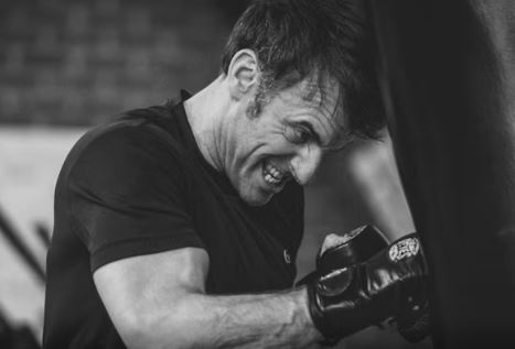 'माचो' मैक्रॉन ने मूडी ब्लैक एंड व्हाइट तस्वीरों में पंचिंग बैग क...