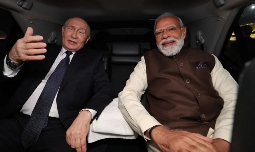 • तस्वीर: पालम से जब नरेंद्र मोदी और व्लादिमीर पुतिन पीएम आवास (7 लोक कल्याण मार्ग) आ रहे थे, तभी कार में दोनों ने एक साथ यह तस्वीर खिंचवाई थी, जो अब अमेरिकी संसद में बहस का विषय बन गई है।