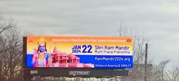 अयोध्या में श्री राम मंदिर के अभिषेक कार्यक्रम को लेकर देशभर में उत्साह और खुशी का माहौल है। भारत से हजारों मील दूर अमेरिका भी इससे अछूता नहीं है. अमेरिकी राज्यों में 22 जनवरी 2024 के कार्यक्रम की जानकारी प्रसारित की जा रही है. विश्व हिंदू परिषद ने अमेरिका के 10 राज्यों में श्री राम मंदिर प्राण प्रतिष्ठा कार्यक्रम के 40 बड़े होर्डिंग लगाए हैं. इसके अलावा 22 जनवरी को अमेरिका में कई कार्यक्रम आयोजित किये जायेंगे.