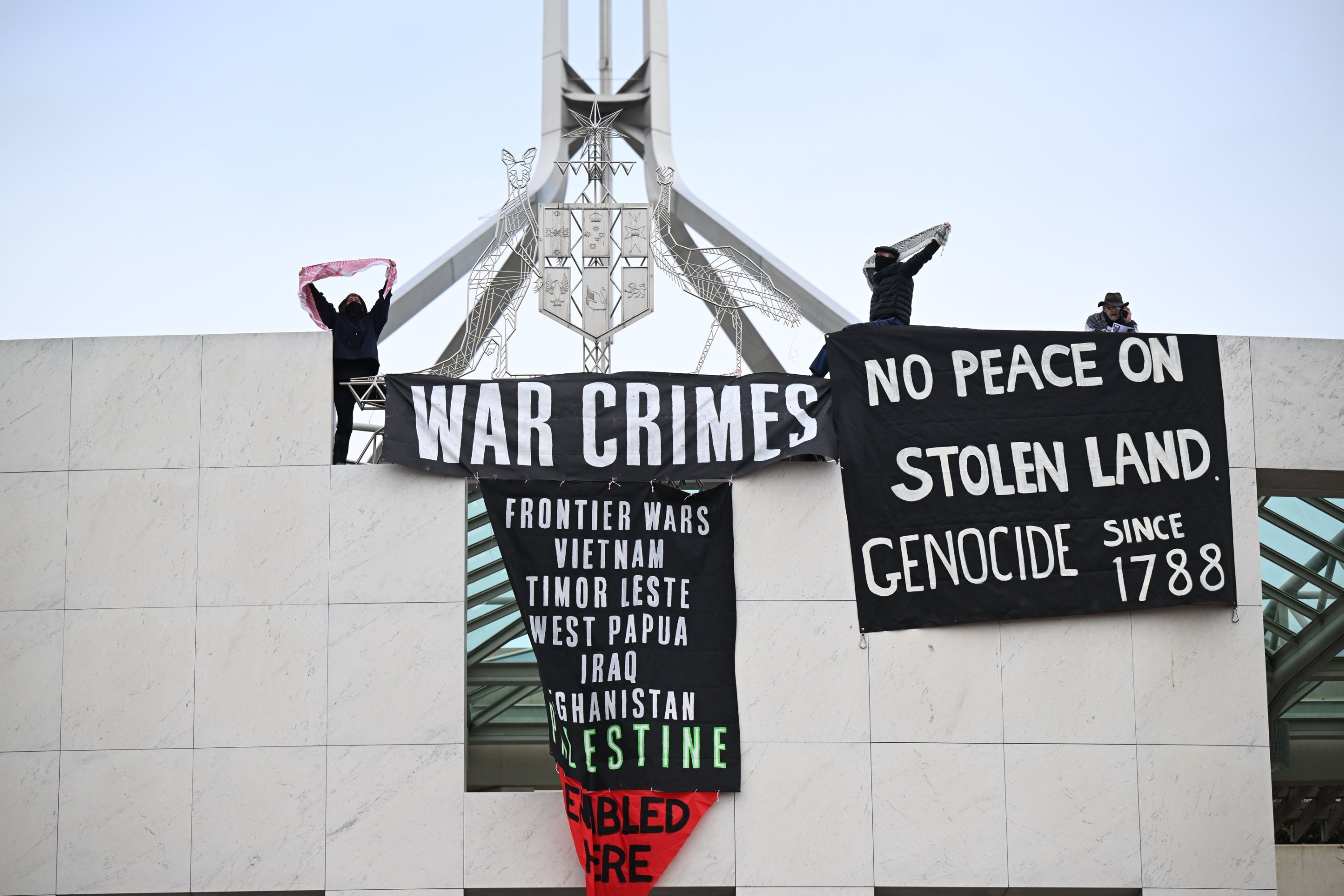 ऑस्ट्रेलिया के कैनबरा में फ़िलिस्तीन समर्थक प्रदर्शनकारियों ने संसद भवन की छत पर दंगा किया। गुरुवार की सुबह, चार फिलिस्तीन समर्थक प्रदर्शनकारियों का एक समूह संसद भवन की छत पर चढ़ गया, जहां उन्होंने इमारत के सामने बैनर लटका दिए। बैनर में सरकार पर युद्ध अपराधों में संलिप्तता का आरोप लगाया गया।