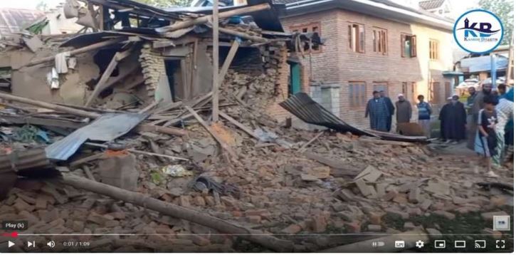 तीसरी तस्वीर: यह तस्वीर कश्मीर पैट्रियट की एक रिपोर्ट से ली गई है, जिसमें त्राल इलाके में सुरक्षा बलों की तलाशी के दौरान एक मकान को विस्फोट से क्षतिग्रस्त होते दिखाया गया।