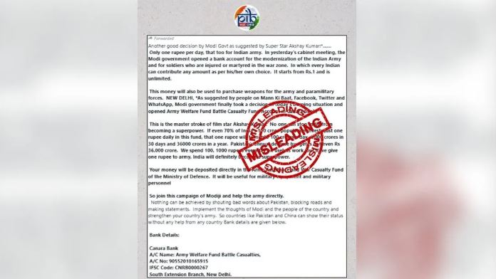 "सोशल मीडिया पर एक व्हाट्सएप मैसेज वायरल हो रहा है जिसमें कहा गया है कि भारत सरकार ने सेना के आधुनिकीकरण के लिए बैंक खाता खोला है। यह दावा फर्जी और भ्रामक है। कृपया ऐसे संदेशों को शेयर न करें।"