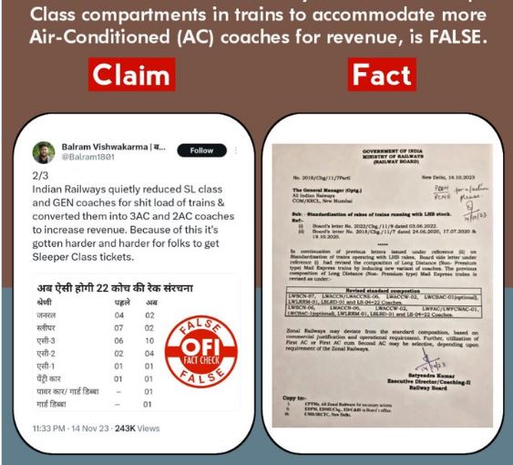 A false claim is being shared that Indian Railways has reduced sleeper and general coaches in trains to give priority to AC coaches so that they can generate more revenue. However, a letter from the Railway Board clarified that the composition of the 22-coach train remains… pic.twitter.com/MPwc5arori