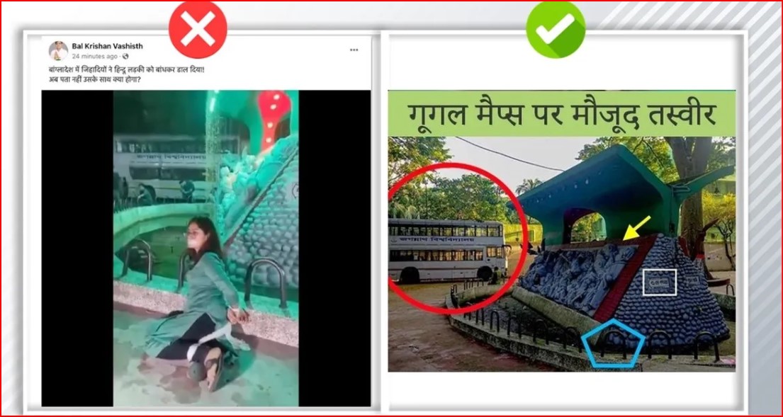 वायरल वीडियो को फेसबुक पर शेयर करते हुए एक यूजर ने लिखा, ''बांग्लादेश में जिहादियों के चंगुल में फंसी एक बेबस हिंदू लड़की, कोई मदद के लिए आगे नहीं आ रहा. कुछ समय बाद जंगली भेड़िये उसे अपनी हवस का शिकार बनाकर मार डालेंगे, अभी भी समय है भारत के पाखंडी हिंदुओं को जागने का।