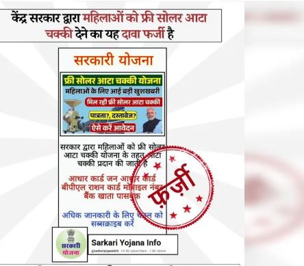 “यूट्यूब चैनल पर चल रहा दावा कि केंद्र सरकार महिलाओं को फ्री सोलर आटा चक्की दे रही है, गलत है। वर्तमान में ऐसी कोई सरकारी योजना नहीं है। कृपया ऐसे फर्जी दावों से सावधान रहें।”