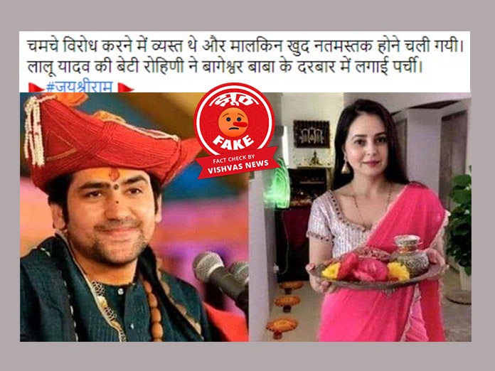 धीरेंद्र कृष्ण शास्त्री पटना में अपना दरबार लगाकर बागेश्वर धाम लौट आए हैं मगर इसी बीच सोशल मीडिया पर एक लालू यादव की बेटी रोहिणी आचार्य को लेकर एक पोस्ट वायरल हो रही है, जिसमें रोहिणी आचार्य और धीरेंद्र कृष्ण शास्त्री की तस्वीरों का कोलाज शेयर किया जा रहा है और ऐसा दावा किय जा रहा है कि, राजद के विरोध के बावजूद रोहिणी ने बागेश्वर बाबा के दरबार में पहुंची और पूजा की । मगर जब हमने इस दावे की सच्चाई का पता लगाया तो पाया कि ये दावा पूरी तरह से झूठा हैं ।दरअसल,रोहिणी आचार्य इस समय सिंगापुर में हैं और वो धीरेंद्र कृष्ण शास्त्री के दरबार में नहीं गई है। पोस्ट की गई रोहिणी आचार्य की तस्वीर भी पुरानी है, वर्तमान की नहीं ।