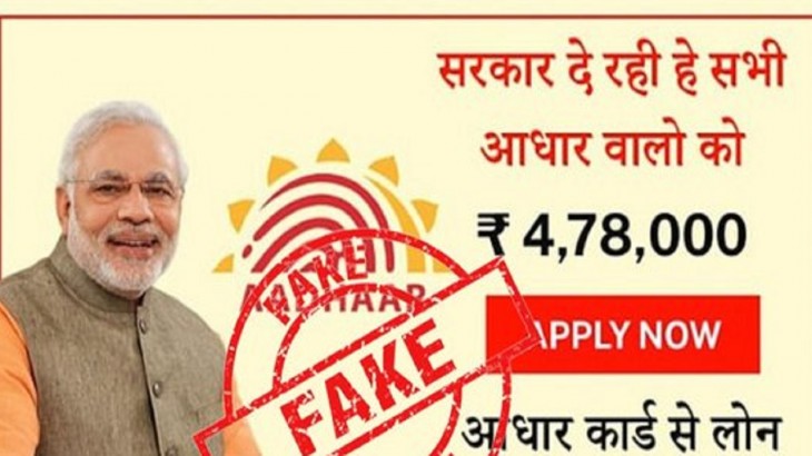 इन दिनों, सोशल मीडिया पर ऐसा दावा किया जा रहा है कि केंद्र सरकार आधार कार्ड पर आपको करीब चार लाख से अधिक का लोन दे रही है । बता दें कि, जैसे ही ये सूचना सोशल मीडिया पर वायरल हुई तो लोग इसकी सच्चाई का पता लगाने में लग गए । बता दें कि, इस वायरल मैसेज को सच बताने के लिए इस मैसेज पर पीएम मोदी की तस्वीर भी लगाई गई है । इस मैसेज में लोन की राशि 4,78,000 रुपये तय की गई हैं ।मगर जब पीआईबी फैक्ट चेक ने इसकी सत्यता की जांच की तो बताया कि ये मैसेज पूरी तरह से फर्जी है ।