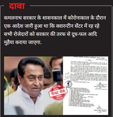 कुछ सोशल मीडिया यूजर्स एक सरकारी दस्तावेज शेयर कर आरोप लगा रहे हैं कि कमल नाथ सरकार ने कोरोना काल में रमजान के मद्देनजर क्वारेंटाइन सेंटर में रह रहे सभी मुसलमानों को दूध और फल आदि उपलब्ध कराने का आदेश जारी किया था. लेकिन हिंदुओं के लिए ऐसी कोई व्यवस्था नहीं की गई.