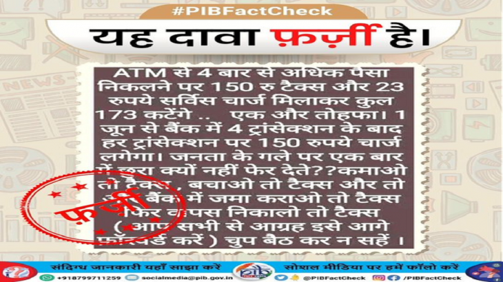 सोशल मीडिया पर इन दिनों एक मैसेज वायरल हो रहा है। दावा किया जा रहा है कि एटीएम से चार बार से ज्यादा पैसा निकालने पर खाते से 173 रुपये काट लिए जाएंगे. यह मैसेज ट्विटर पर शेयर किया गया है। इसमें कहा गया है कि एक एटीएम से चार नकद निकासी के लिए 150 रुपये का कर और 23 रुपये का सेवा शुल्क 173 रुपये वसूला जाएगा। ये नियम 1 जून से लागू हैं। इस संदेश में सरकार की कार्यशैली की आलोचना हो रही है. महंगाई की शिकायत की जा रही है। लेकिन जब पीआईबी फैक्ट चेक ने मैसेज की जांच की तो वह फर्जी निकला। पीआईबी फैक्ट चेक टीम ने बताया कि आपके बैंक से हर महीने पांच फ्री ट्रांजैक्शन किए जा सकते हैं। बाद के लेनदेन में अधिकतम 21 रुपये की कटौती की जाएगी। अलग से कोई टैक्स नहीं देना होगा।